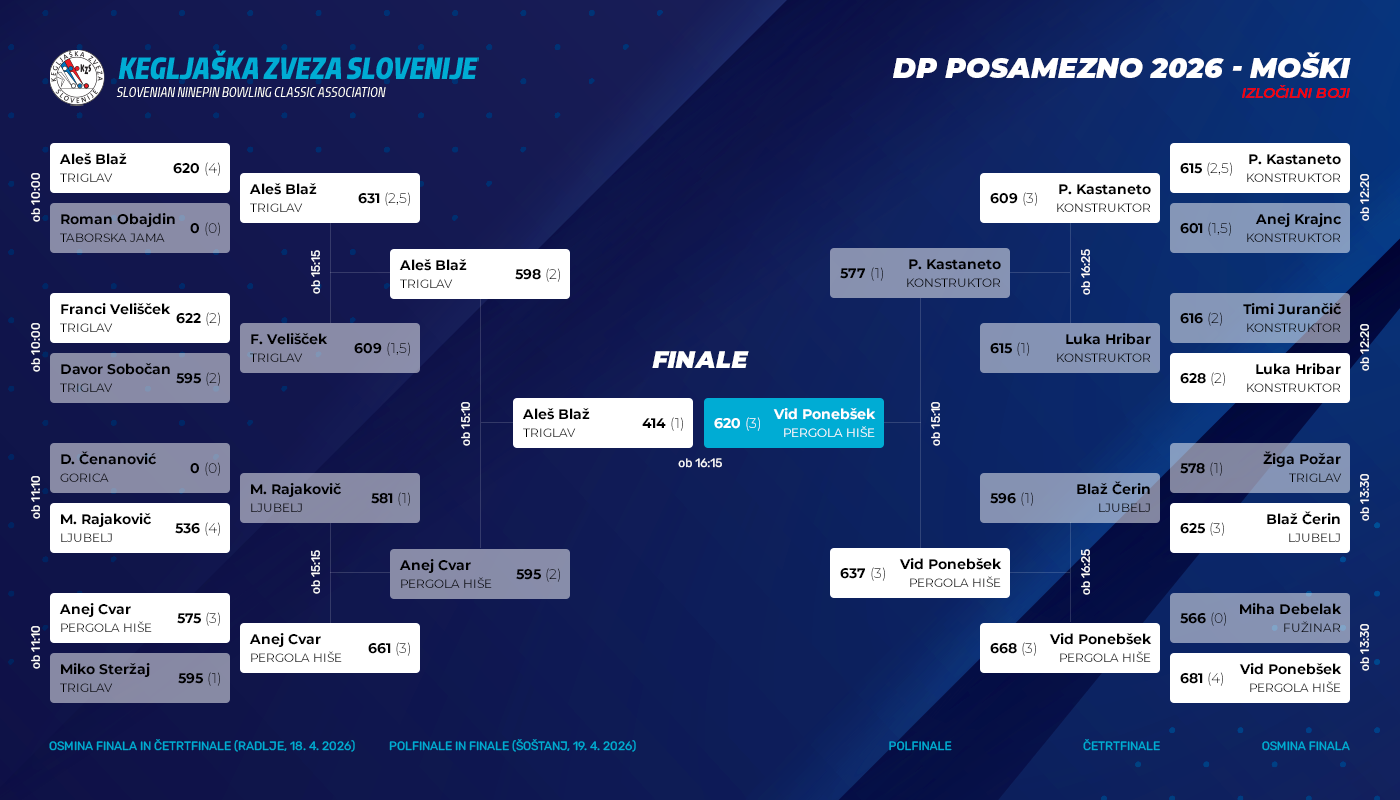 Popoldne so tekmovalci odigrali še dvoboje četrtfinala, po katerih smo dobili vseh osem polfinalistov, ki so se med seboj pomerili v nedeljo v Šoštanju. Klubski kolegici Lidija Pirman in Lea Drnovšek sta v napetem zaključku polfinalnih dvobojev ugnali Karmen Jurančič oziroma Alenko Jakša Mojškerc, v finalu pa je bilo vse odločeno že po treh setih, ko se je Lea že lahko razveselila naslova državne prvakinje. Pri fantih je Blaž šele v zaključku uspel streti odpor Aneja Cvara, medtem ko je Ponebšek prikazal še eno odlično predstavo in zanesljivo opravil s Kastanetom. V finalu se je fantoma nekoliko poznala utrujenost, nekoliko več moči pa je vendarle imel Ponebšek, ki se je tako zasluženo veselil novega naslova državnega prvaka.